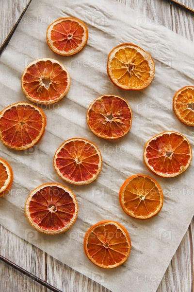 Кусочки сухих оранжевых фруктов на сетке, плоские, на белом фоне