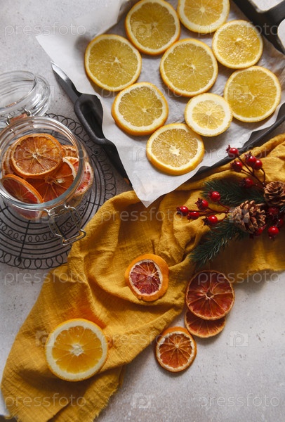 Кусочки свежих апельсинов на сковороде и сухие апельсиновые чипсы в стеклянной банке на белом столе с веткой новогоднего декора, плоская планировка