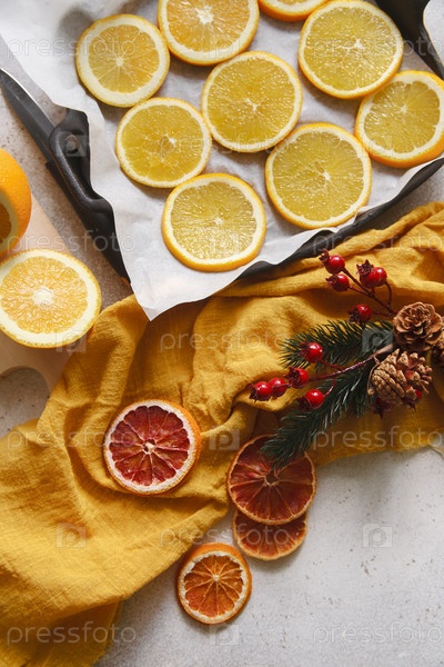 Ломтики свежих апельсинов на сковороде и разделочной доске на белом столе с веткой новогоднего декора, плоская планировка, концепция рождественского декора