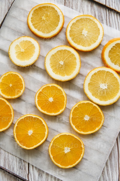 Кусочки свежих оранжевых фруктов на решетке, подготовленные для сушки в духовке, плоские, на белом фоне