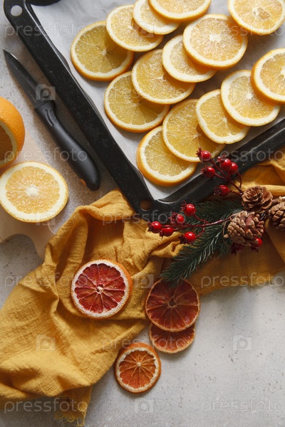 Кусочки сухих и свежих оранжевых фруктов на подносе на белом столе с веткой новогоднего декора, плоская планировка