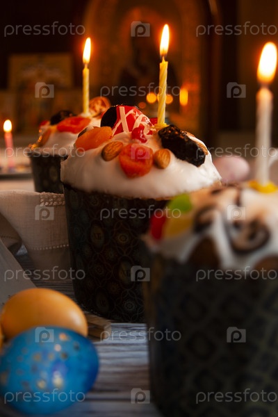 Пасхальный натюрморт с пасхальным куличом, пасхальными яйцами и горящими свечами в темноте монастырской церкви с русскими иконами на заднем плане, крупным планом, выборочный фокус