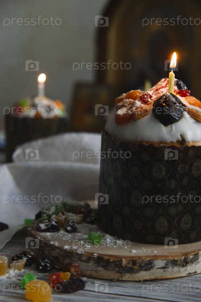 Натюрморт с куличами на монастырской кухне с горящей свечой и иконой на заднем плане, выборочный фокус
