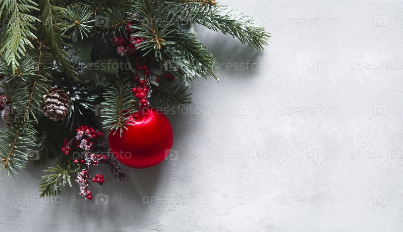 Рождественские обои из еловых веток, красного шарика, красных ягод и минусов на сером фоне. Рождественские обои