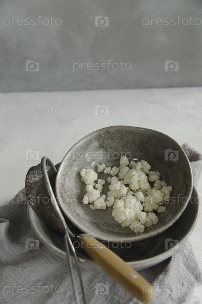 Зерна молочного кефира в серой тарелке с ситечком и ложкой на белом фоне., выборочный фокус, крупный план. Кефир – кисломолочный напиток, зерна – это сочетание бактерий и дрожжей