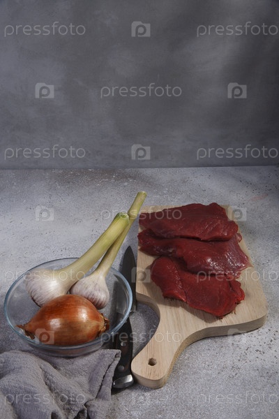 Несколько кусочков сырой говядины на кухонной доске с чесноком и луком на сером фоне