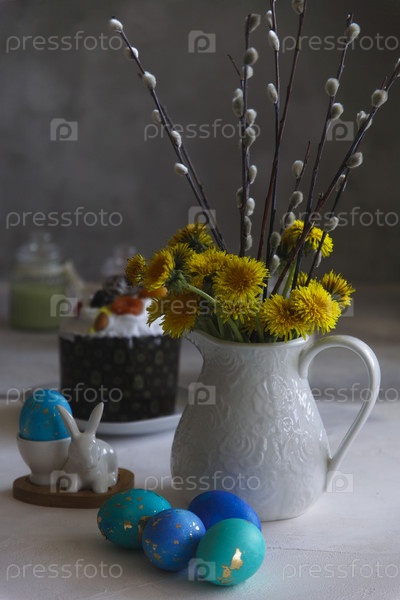 Пасхальный натюрморт с голубыми яйцами и кроликом, букетом ветвей ивы и желтыми одуванчиками на белом столе и сером фоне, выборочный фокус