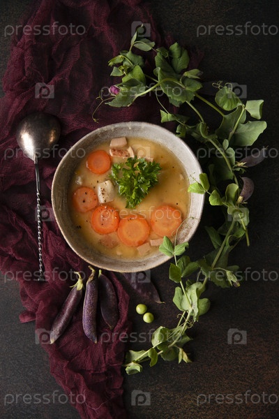 Свежий домашний гороховый суп на темном фоне и фиолетовой ткани на деревенской кухне, плоская планировка, сдержанный ключ