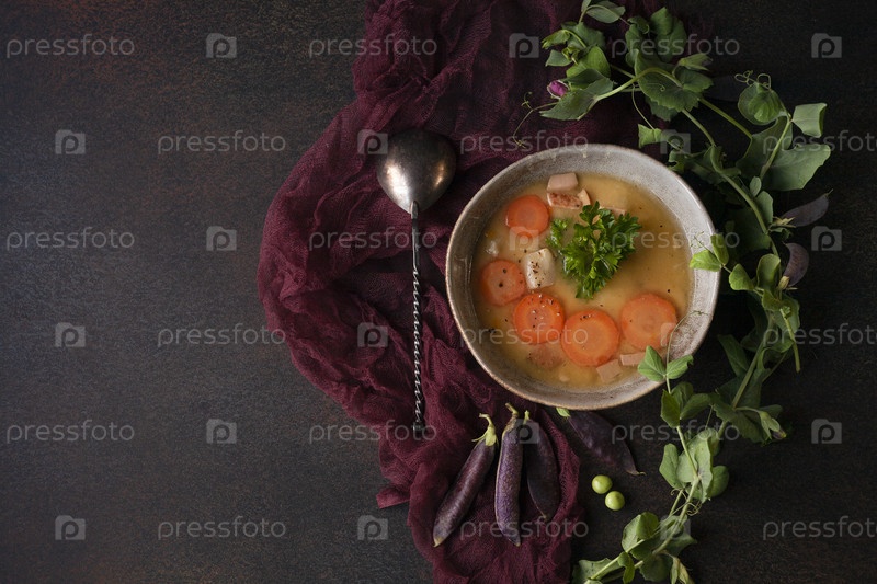 Свежий домашний гороховый суп на темном фоне и фиолетовой ткани на деревенской кухне, плоская планировка, сдержанный ключ