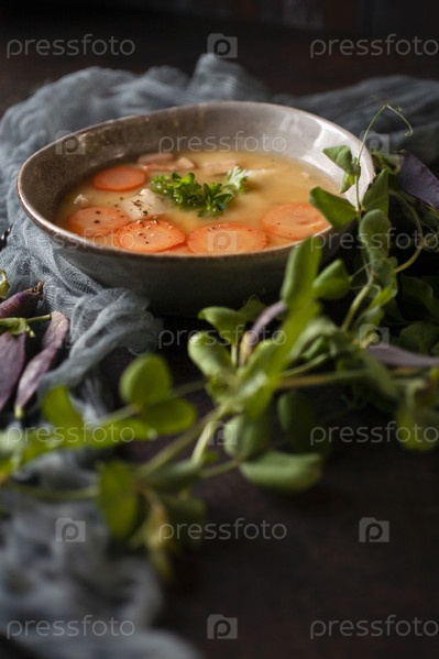 Свежий домашний гороховый суп со свежими растениями гороха и стручками вокруг миски на темном фоне с зеленоватой кухонной тканью на деревенской кухне, концепция летнего супа, избирательный фокус, сдержанный ключ
