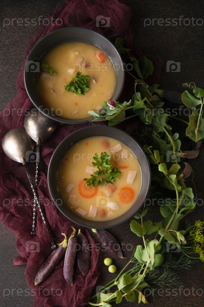 Свежий домашний гороховый суп в двух тарелках со свежими растениями гороха на темном фоне с фиолетовой кухонной тканью на деревенской кухне, концепция летнего супа, плоская планировка, вид сверху, сдержанный ключ