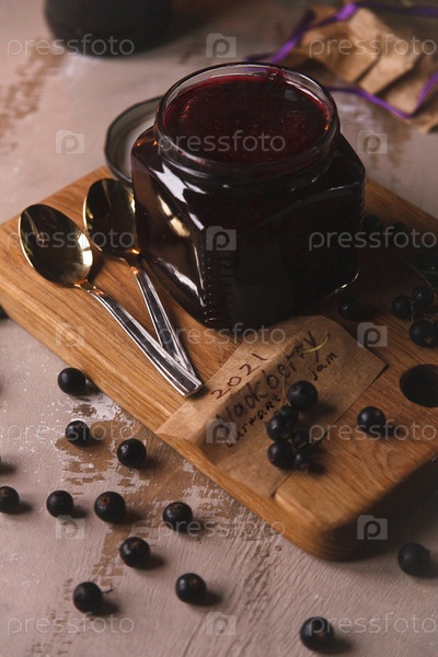 Стеклянная банка с вареньем из черной смородины на темной деревенской кухне