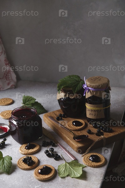Варенье из черной смородины в стеклянных банках с ягодами черной смородины и зелеными листьями на белом столе и сером фоне