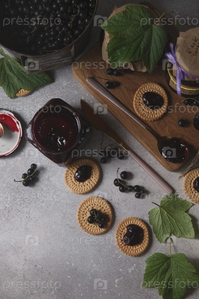 Варенье из черной смородины в стеклянных банках и круглое печенье с вареньем из черной смородины на завтрак на белом столе, плоская планировка