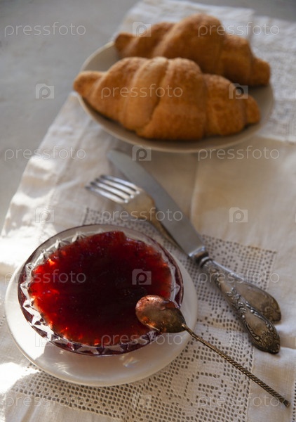 Клубничное варенье на тарелке с двумя круассанами на белом столе, концепция завтрака