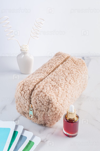 Туалетная сумка для различных туалетных принадлежностей и средств ухода за собой на столе. набор тканевых масок и флакон-капельница с косметическим маслом рядом