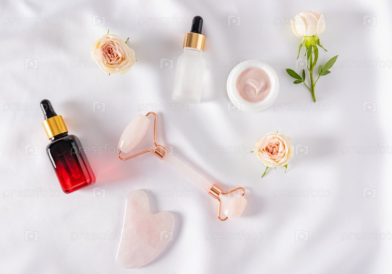 Вид сверху на косметику в бутылках, баночку для ухода за телом и кварцевый массажер со скребком гуаша. Ткань белый атласный фон. Плоская планировка