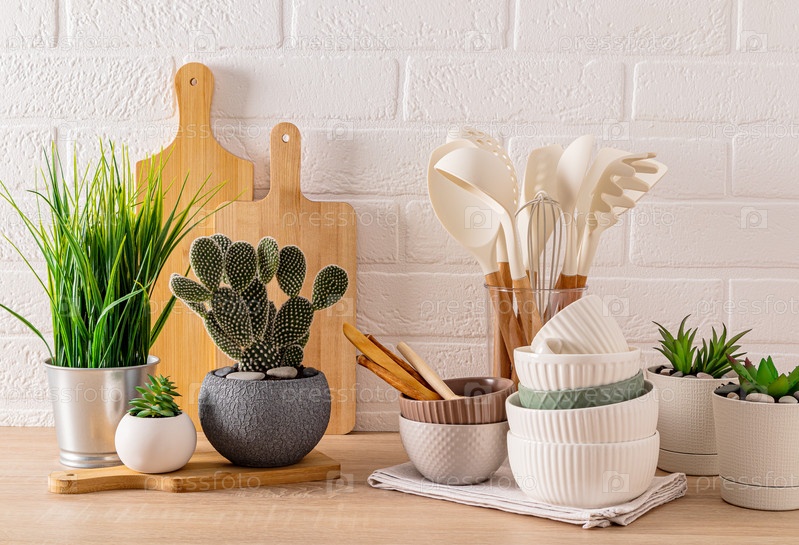 Светлый кухонный фон с деревянной экологически чистой кухонной утварью. разные зеленые растения в горшках. экологически чистое современное кухонное пространство. Уютный дом