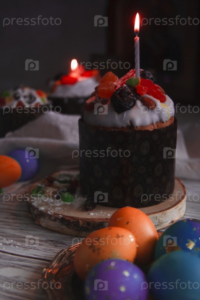 Пасхальный натюрморт с пасхальным куличом, пасхальными яйцами, горящими свечами в темноте монастырской церкви, крупным планом, крупным планом, выборочный фокус
