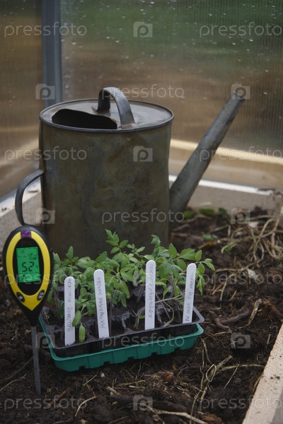 Саженцы томатов в контейнере в теплице со старой лейкой и цифровым термометром, весенние работы в концепции сада, избирательный фокус