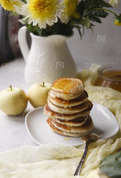 Натюрморт со стопкой яблочных блинов с рукой, разливающей мед, и букетом желтых цветов в белой вазе на белой тарелке с желтыми яблоками и желтой тканью, выборочный фокус, концепция летнего завтрака