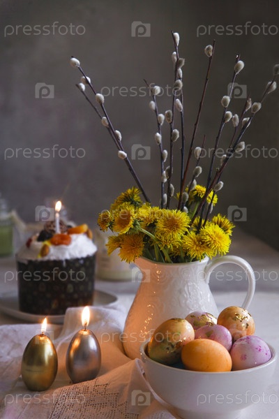 Пасхальный натюрморт с оранжевыми и розовыми яйцами, горящими свечами, букетом ветвей ивы и желтыми одуванчиками на белом столе и сером фоне, выборочный фокус