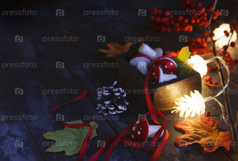 Натюрморт с новогодними игрушками, шишками, красными ягодами, оранжевыми листьями, огнями и красными грибами в винтажной коробке, рождественская композиция на синем деревянном столе, сдержанный ключ, избирательный фокус