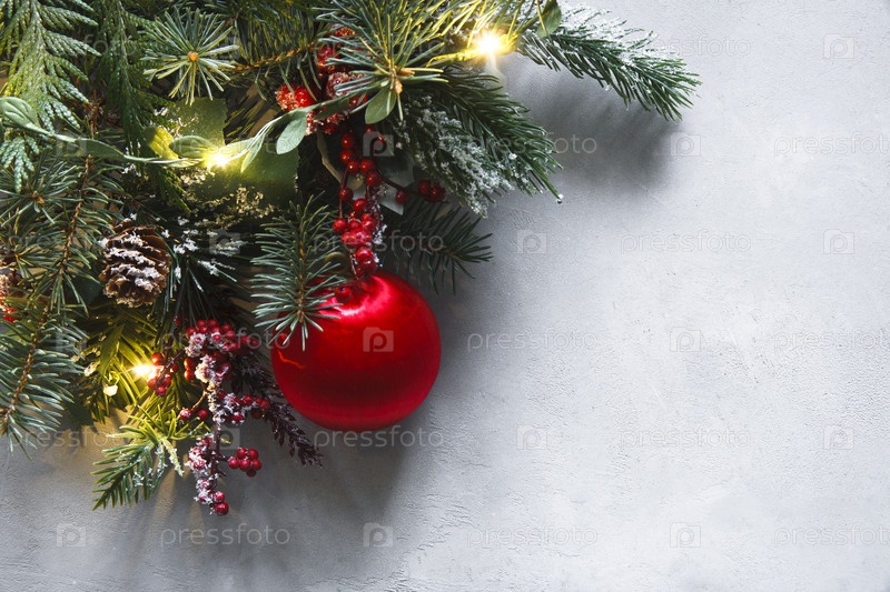 Рождественские обои, сделанные из еловых веток, красного шарика, красных ягод, огней и минусов на сером фоне. Рождественские обои