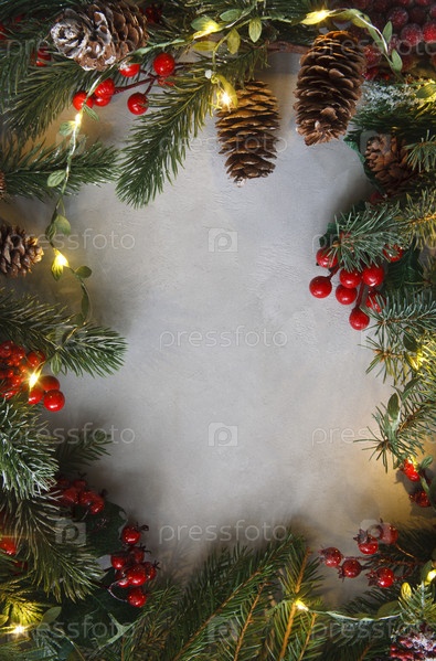 Рождественская рамка из еловых веток, красных ягод, огней и минусов на сером фоне. Рождественские обои. Плоская планировка, вид сверху, место для копирования посередине
