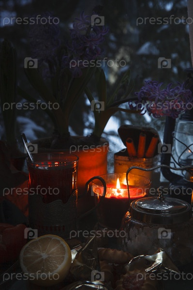 Натюрморт с чашкой чая, горящей свечой и цветами гиацинта в горшках перед замерзшим зимним окном, уютная вечерняя концепция