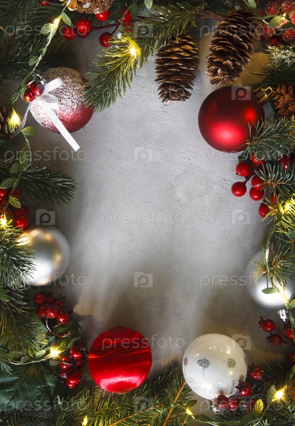 Рождественская рамка из еловых веток, красных ягод, огней, воздушных шаров и минусов на сером фоне. Рождественские обои
