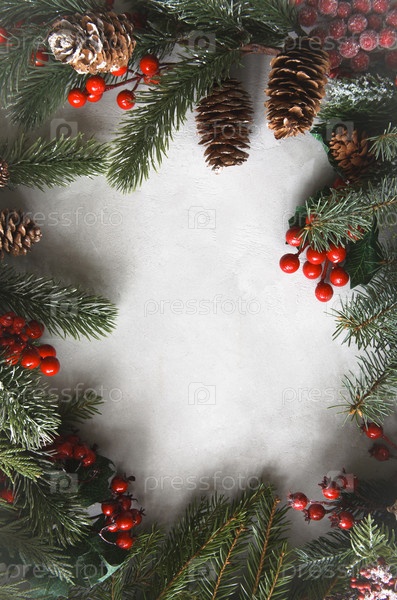 Рождественская рамка из еловых веток, красных ягод и минусов на сером фоне. Рождественские обои. Плоская планировка, вид сверху, место для копирования посередине
