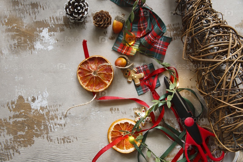 Домашняя гирлада из натуральных материалов - сухие апельсиновые чипсы, имбирное печенье, арконы, ленты и сосновые шишки, экологически чистые, на деревянном столе с огнями, плоская планировка, пространство для копирования