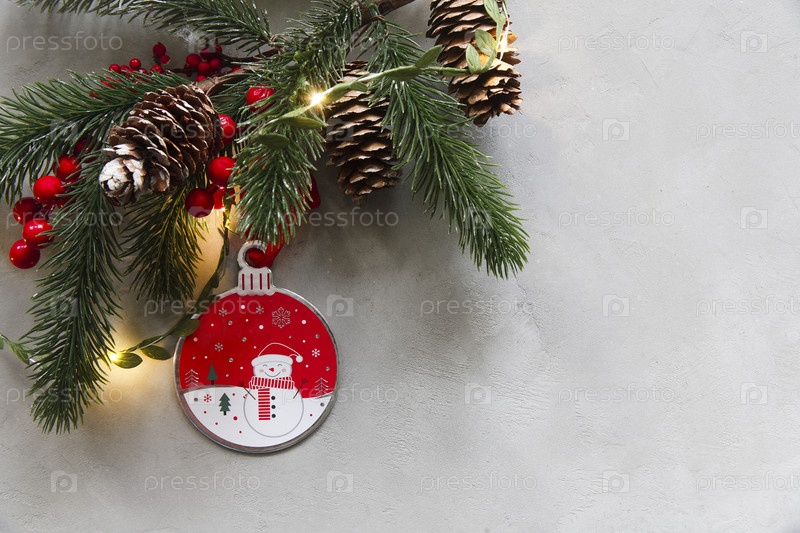 Рождественские обои из еловых веток, красного шарика, красных ягод и минусов на сером фоне. Рождественские обои. Плоская планировка, вид сверху, пространство для копирования
