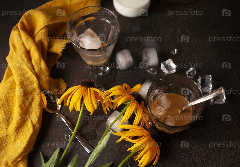 Один полупустой стакан кофе со льдом с бутылкой молока и кусочками льда на коричневом столе с желтой кухонной тканью и желтыми цветами, выборочный фокус, вид сверху
