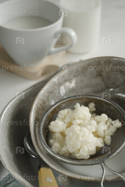 Зерна молочного кефира в ситечке с бутылкой и чашкой кефира на белом столе
