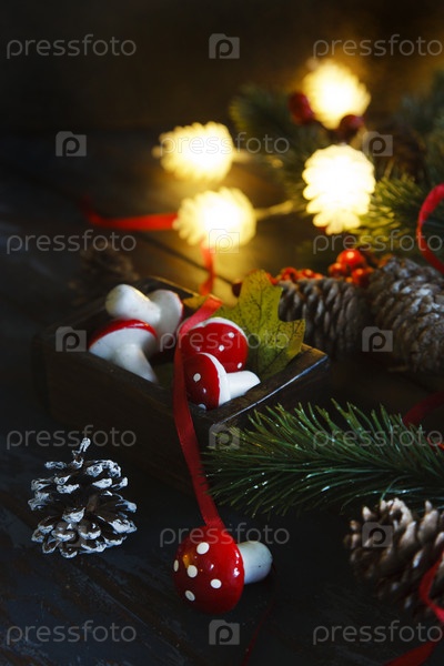 Натюрморт с новогодними игрушками, шишками, красными ягодами, оранжевыми листьями, огнями и красными грибами в винтажной коробке, рождественская композиция на синем деревянном столе, сдержанный ключ, избирательный фокус
