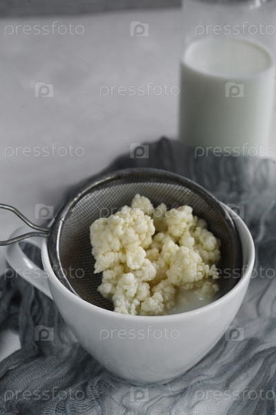 Молочные кефирные зерна в сите с бутылкой кефира на белом столе