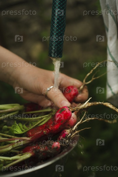 Женские руки собирали в саду пучок редиса, избирательный фокус