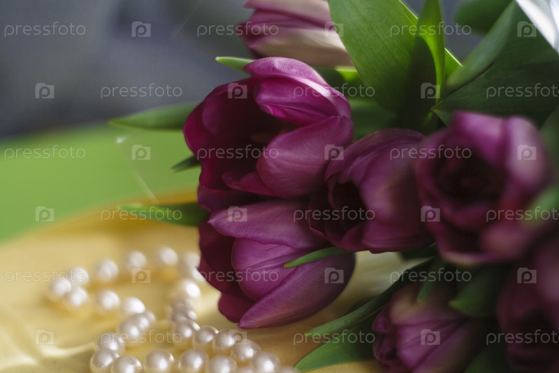 Букет свежих фиолетовых тюльпанов на желтом и зеленом фоне с жемчужными бусинами. Концепция весны, 8 марта и концепция Дня Святого Валентина, выборочный фокус