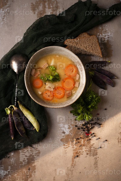 Свежий домашний гороховый суп со свежими листьями петрушки, стручками гороха и двумя ломтиками хлеба на бежевом фоне и темно-зеленой кухонной тканью на деревенской кухне, плоская планировка, вид сверху