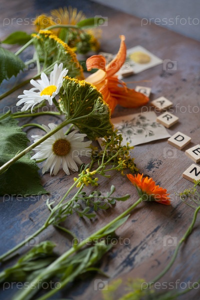 Летний деревенский натюрморт с желтыми цветами коттеджного сада., деревянные кубики с текстом синим деревянным столом, избирательный фокус, концепция хобби в саду