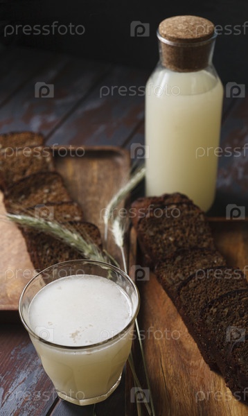 Белый квас или закваска в бутылках и стакане с ломтиками ржаного хлеба и ржаными ушами на темном фоне, сдержанный, избирательный фокус