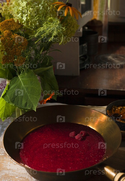 Натюрморт с домашним малиновым вареньем в медной деревенской миске и букетом садовых цветов