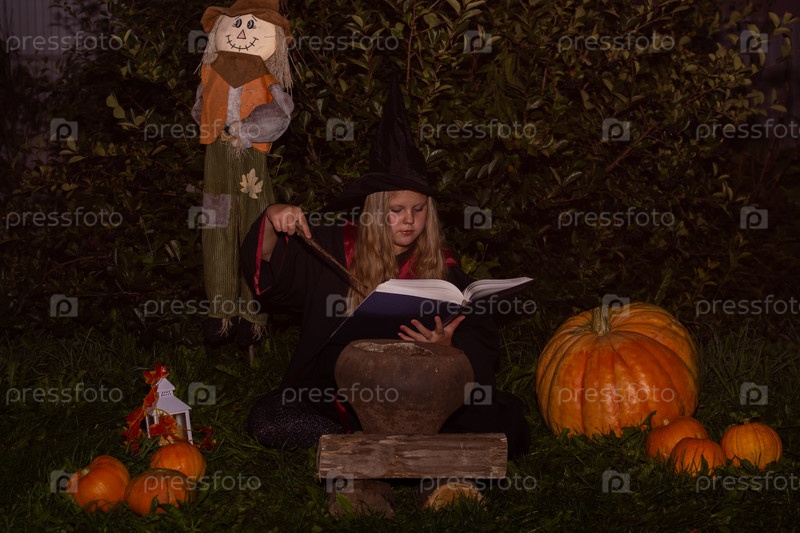 Девочка в мантии и шляпе. Маленькая волшебница в костюме. Сказковая героиня. Ребенок-модель. Девушка в халате и шляпе. Небольшая колдунья в костюме. Сказочная героиня. Ребенок - модель