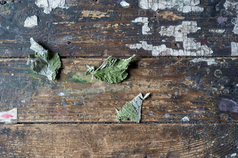 Сухие зеленые листья лежат на старой доске