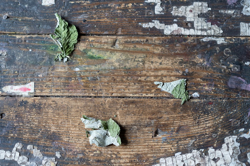 Сухие зеленые листья лежат на старой доске
