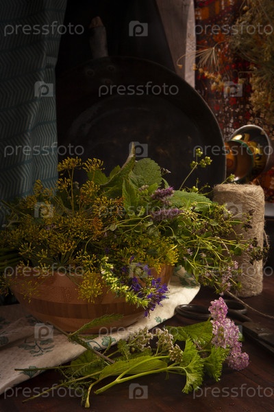 Натюрморт со свежими травами, нарезанными в домашнем саду в деревянной миске на деревенской кухне, сдержанный, избирательный фокус