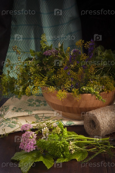 Свежие травы, нарезанные в домашнем саду в деревянной миске на деревенской кухне, сдержанный, избирательный фокус