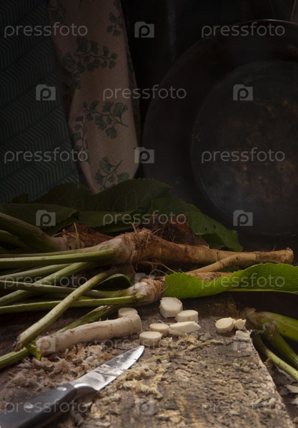 Свежие корни хрена, нарезанные на деревянном столе, сдержанный, избирательный фокус